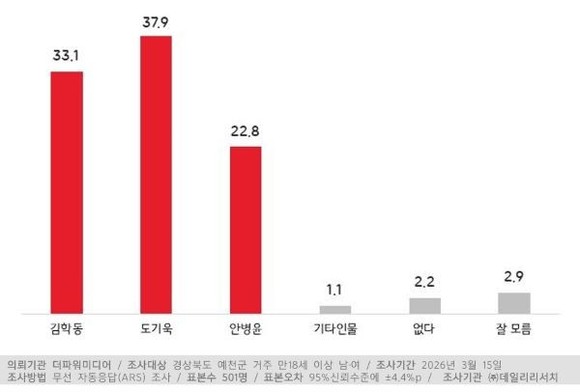 더파워미디어 의뢰로 데일리리서치가 지난 3월 15일 예천군에 거주하는 만 18세 이상 남녀 501명을 대상으로 실시한 조사 결과, 국민의힘 예천군수 후보 적합도는 도기욱 도의원 37.9%, 김학동 군수 33.1%, 안병윤 전 부산시 행정부시장 22.8%로 집계됐다. 두 후보 간 격차는 표본오차(±4.4%포인트) 범위 내다.