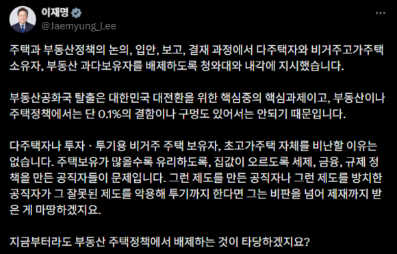 이 대통령은 22일 엑스(X: 옛 트위터)에 “주택과 부동산 정책의 논의, 입안, 보고, 결재 과정에서 다주택자와 비거주 고가 주택 소유자, 부동산 과다 보유자를 배제하도록 청와대와 내각에 지시했다”고 밝혔다.