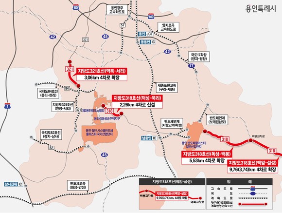 지방도 318호선 독성~백봉, 용인 백암~이천 설성 구간 확장 사업은 각각 반도체클러스터 일반산업단지 동측에서 백암면 백봉교차로까지 5.53㎞, 백암면 백봉교차로에서 이천 설성면 대죽교차로까지 9.76㎞ 등 총 15.3㎞ 구간을 4차로로 확장하는 공사다.