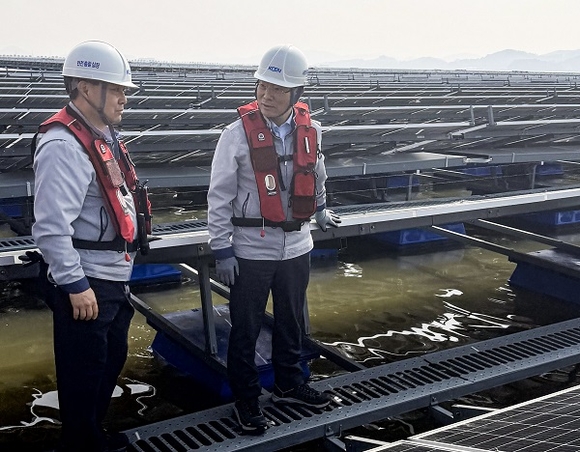 조영혁 사장직무대행이 26일 수상태양광 안전점검을 하고 있다.(사진=남동발전 제공)