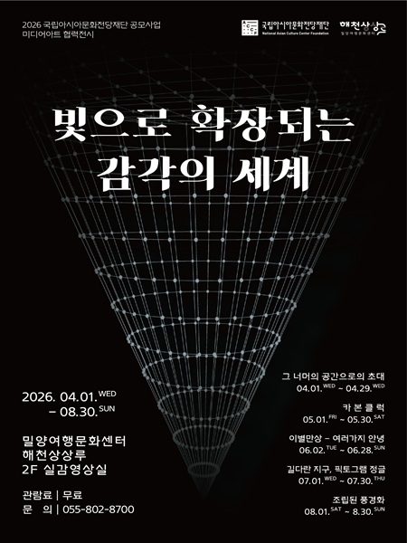 밀양문화관광재단이 국립아시아문화전당재단이 주관한 '미디어아트 협력 전시' 공모사업에 선정돼 오는 4월 1일부터 8월 30일까지 밀양여행문화센터 해천상상루에서 미디어아트 전시 '빛으로 확장되는 감각의 세계'를 개최한다.