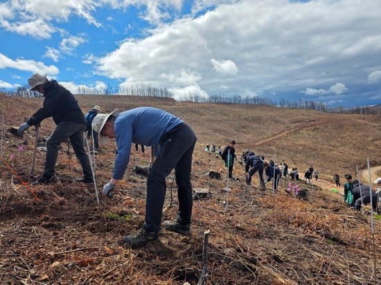SKT와 유한킴벌리 임직원·가족 100여 명이 안동 산불 피해 지역에서 나무심기 활동을 하고 있는 모습 (사진=SK텔레콤)