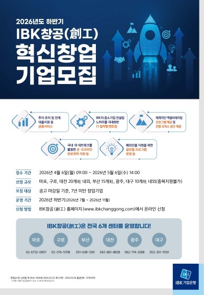 IBK기업은행 창업육성 플랫폼 ‘IBK창공(創工)’이 ‘2026년 하반기 혁신창업기업’을 모집한다고 7일 밝혔다.