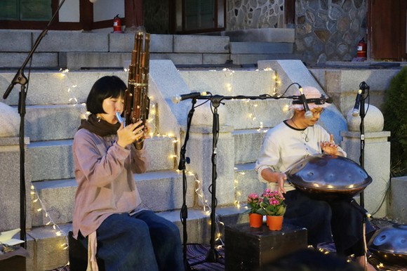 이날 무대에는 월드뮤직 그룹 ‘타기(TAGI)’가 올라 신비로운 음색의 타악기인 핸드팬을 중심으로 생황, 피리, 태평소, 정주 등 국악기가 어우러진 독특한 연주를 선보였다. 40여 명의 관객은 핸드팬의 잔잔한 울림과 생황의 깊은 선율이 빚어내는 조화에 몰입하며 고즈넉한 봄밤의 정취를 만끽했다.