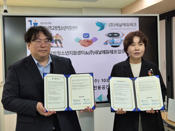과천시청소년재단 학교밖청소년지원센터 ‘과천꿈드림’은 지난 8일, 두 번째 샛뜨락에서 ㈜새날에듀테크와 학교밖청소년 대상 ‘인공지능(AI) 로봇교육 협력을 위한 업무협약’을 체결했다고 밝혔다.
