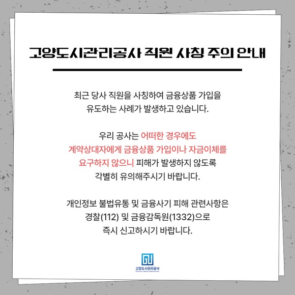고양도시관리공사가 최근 공사 직원을 사칭해 물품 대금 대납이나 보험 등 금융상품 가입을 요구하는 사기 시도와 관련해 업체 관계자들에게 주의를 당부했다.