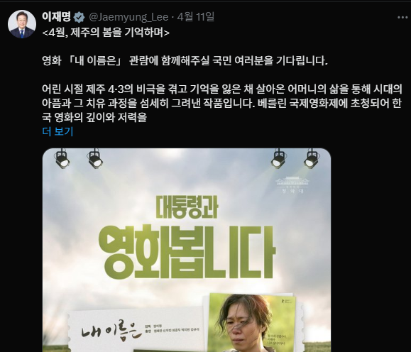 이스라엘의 레바논 침공과 양민학살과 관련해 인권 논쟁을 벌여 국제적으로 화제가 된 이재명 대통령은 제주 4·3 사건을 다룬 영화 ‘내 이름은’을 오는 15일 개봉일에 맞춰 시민 165명과 함께 관람할 예정이다.