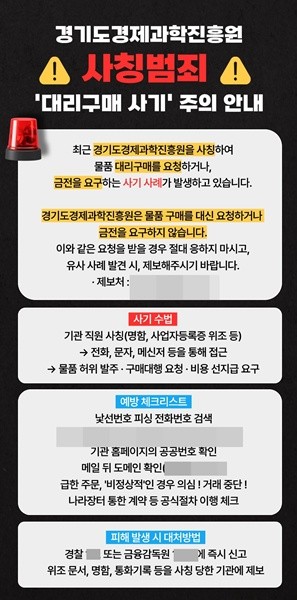 경기도경제과학진흥원은 최근 기관 직원을 사칭한 대리구매 사기 피해 사례가 확인됨에 따라, 기업을 대상으로 예방 안내를 강화하고 각별한 주의를 당부했다. 기관 내 특정 부서를 사칭해 신뢰를 높이는 수법이 확인되며 도내 기업을 중심으로 피해 확산 우려가 커지고 있다.