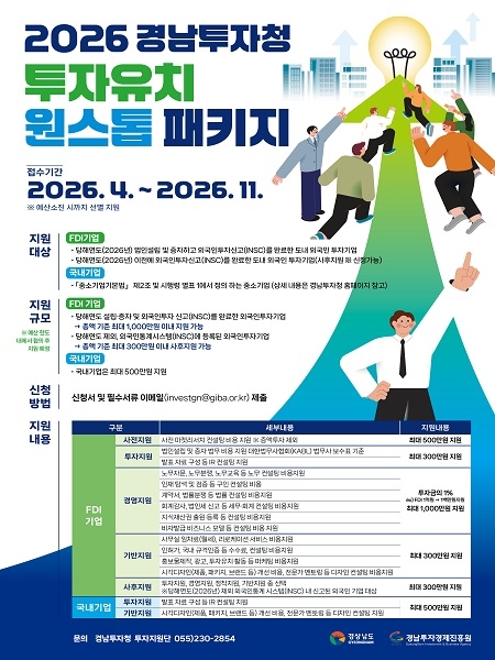 경남투자경제진흥원 경남투자청은 도내 투자기업의 안정적인 정착과 성장을 지원하기 위해 '2026년 투자유치 원스톱 패키지 서비스'를 추진한다고 16일 밝혔다.