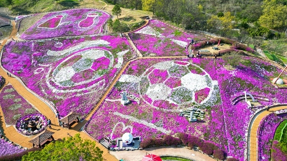 생초꽃잔디축제가 한창인 16일 경남 산청군 생초면 국제조각공원에 꽃잔디가 만개해 분홍빛 물결로 장관을 이루고 있다.