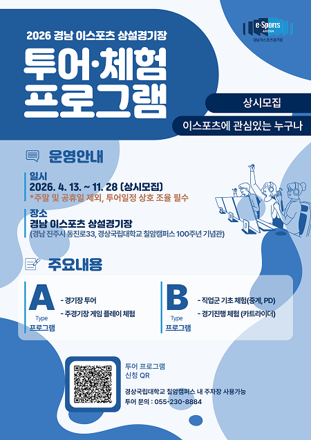 경남문화예술진흥원은 이달부터 오는 12월 4일까지 진주시에 위치한 경남 이스포츠 상설경기장에서 ‘경남 이스포츠 상설경기장 투어체험 프로그램’을 운영한다고 16일 밝혔다.