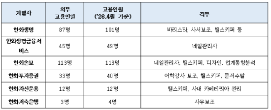 회사별로는 한화생명 101명, 한화생명금융서비스 49명, 한화손보 113명, 한화투자증권 40명, 한화자산운용 12명, 한화저축은행 4명 등 전 계열사가 의무고용 기준을 충족하거나 상회하고 있다는 설명이다.