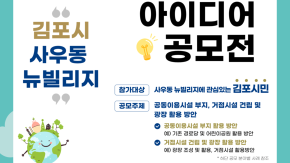 김포시가 사우동 뉴빌리지 사업과 연계해 거점시설 조성과 운영 방향을 정하는 시민 아이디어 공모전을 연다. 공모 접수는 내달 1일까지 진행된다. 시민 제안을 반영해 원도심 거점시설 활용도를 높이겠다는 구상이다.