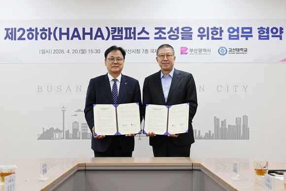 부산시와 고신대학교는 20일 오후 시청 국제의전실에서 '제2하하(HAHA)캠퍼스' 조성을 위한 업무협약을 체결했다.
