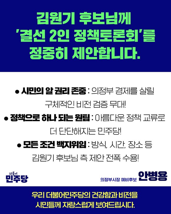더불어민주당 의정부시장 경선이 결선 투표를 앞두고 정책 검증을 둘러싼 토론 촉구로 이어지고 있다. 안병용 예비후보가 결선 상대인 김원기 예비후보에게 공개 토론을 재차 요구하며 투표 전 마지막 정책 대결을 압박하고 나섰다.