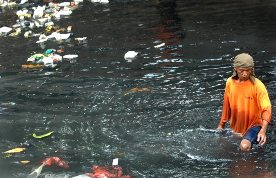 ▲인도네시아 자카르타의 오염된 한 강에서 한 사람이 쓰레기를 모으고 있다. 자카르타의 많은 강들은 사람들이 버린 쓰레기로와 정부의 느슨한 오염 관리, 부족한 정화 시스템 등으로 인해 점점 오염돼 가고 있다. (신화/뉴시스)