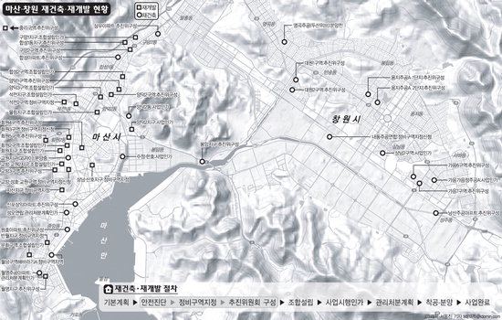 다른 지구도 일단은 통합시 이후 시장 분위기에 따라 움직일 것으로 보인다. 한 재건축 조합장은 "현재 마산 지역 재건축 사업은 대부분 진행을 멈춘 것으로 안다"며 "시공사든 조합이든 통합 이후를 기다리는 분위기"라고 전했다.